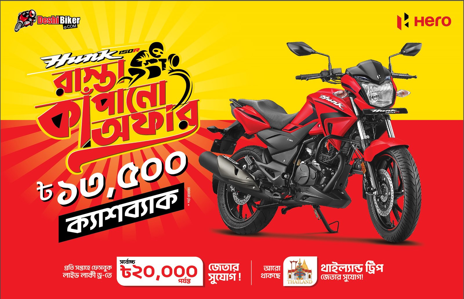 Hero Bangladesh newest offer is designed to make your dream all in one. With every purchase of Hero Hunk 150R you will get instant 13,500 taka cashback, if you are lucky one then you have a chance to win Thailand trip and 20,000 taka price money.